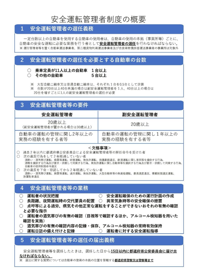 この制度は、企業が保有する車両が増加し、企業が関与する交通事故が多かった1971年(昭和46年)に道路交通法で義務化されました。社内に交通安全管理の責任者を置くことで事故を減らす目的があります。